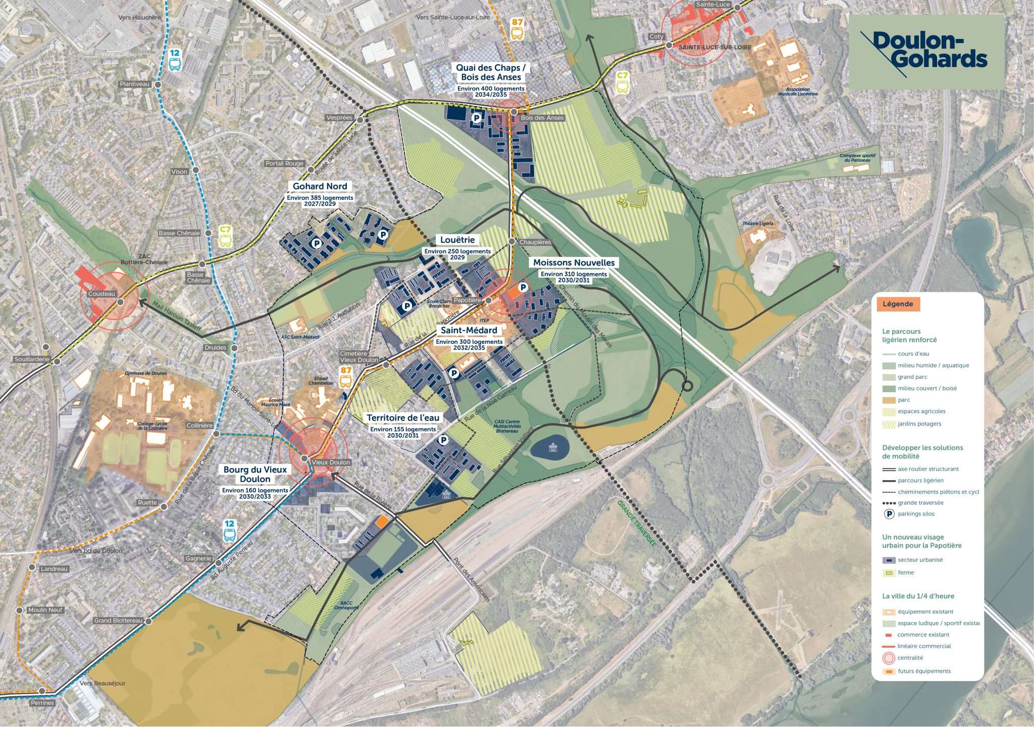 Le nouveau plan guide concentre ainsi l’urbanisation autour de la rue de la Papotière, axe central du projet, entre Vieux Doulon et la route de Sainte-Luce-sur-Loire. Le quartier accueillera 2 300 logements neufs.