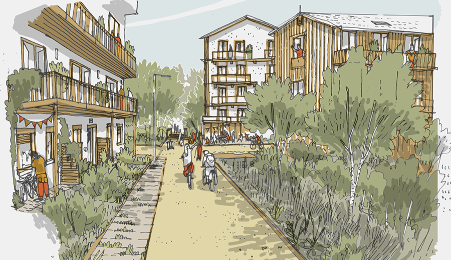 Un grand local vélo et un parking en hauteur équipé de panneaux solaires favoriseront les mobilités actives. Un périmètre dédié aux piétons permettra de se déplacer et d’accéder facilement aux services tout en respectant et valorisant le paysage naturel.
